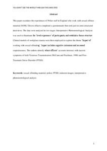 This paper examines the experiences of Police staff in England who work with sexual offence material (SOM). Eleven officers completed a questionnaire then took part in semi-structured interviews. The data were analysed in two stages: Interpretative Phenomenological Analysis was used to illuminate the ‘lived experience’ of participants, and establish a theme structure. Clinical models of workplace trauma were then employed to explore the theme ‘Impact of working with sexual offending’. Impact includes cognitive intrusions and increased suspiciousness. The authors identify where officers’ accounts intersect with nascent symptoms of both Vicarious Traumatisation (McCann and Pearlman, 1990) and Post-Traumatic Stress Disorder (PTSD).