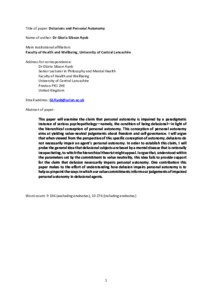 This article will examine the claim that personal autonomy is impaired by a paradigmatic instance of serious psychopathology – namely, the condition of being delusional – in light of the hierarchical conception of personal autonomy. This conception of personal autonomy aims at yielding value‐neutral judgements about freedom and self‐governance. I will argue that when viewed from the perspective of this specific conception of autonomy, delusions do not necessarily impair an agent's personal autonomy. In order to establish this claim, I will probe the general idea that delusional subjects are beset by a mental disease that is rationally incapacitating, to which the hierarchical theorist might appeal. I argue that, understood within the parameters set by the commitment to value neutrality, this idea fails to provide support for the claim that delusion necessarily impairs personal autonomy. One contribution this article makes to the effort of understanding how delusion impairs personal autonomy is to help us pinpoint the ways in which our value commitments inform our judgements of impaired personal autonomy in delusional agents.