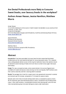 Hassan, A, Hamilton, J and Morris, Matthew Kendrick (2018) Are dental professionals more likely to consume sweet snacks, over savoury snacks in the workplace? British Dental Journal, 225 (11). pp. 1019-1022. ISSN 0007-0610