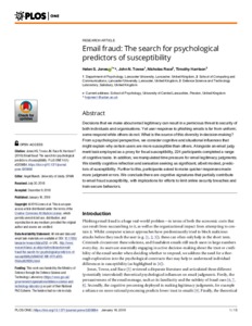 Jones, Helen orcid iconORCID: 0000-0002-2716-051X, Towse, John N., Race, Nicholas and Harrison, Timothy (2019) Email fraud: The search for psychological predictors of susceptibility. PLOS ONE, 14 (1). e0209684.