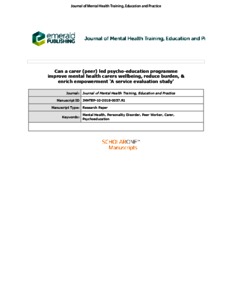 Practical Implications: The evidence from this study indicates that carers are able and willing to attend a group psychoeducational programme. The high number of referrals to the programme in a relatively short timeframe, indicates that there is significant demand for such a service. Implementation of the programme is relatively straight forward. The key challenges for practical implementation are to have the of Mental Health Training, Education and Practiceright carer to lead and deliver the programme, and the right support system in place for them (financial and supervision). Co-production also is not without challenges, the peer worker and occupational staff need to ensure mutually valued and respected working relationship develop.