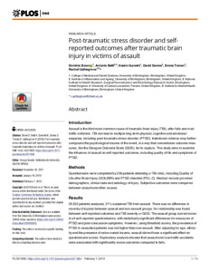 Bown, Dominic, Belli, Antonio, Qureshi, Kasim, Davies, David, Toman, Emma and Upthegrove, Rachel (2019) Post-traumatic stress disorder and self-reported outcomes after traumatic brain injury in victims of assault. PLOS ONE, 14 (2). e0211684.