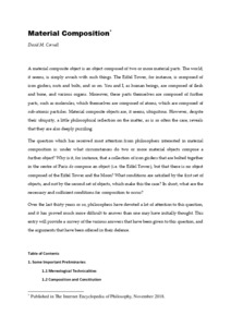 A material composite object is an object composed of two or more material parts. The world, it seems, is simply awash with such things. The Eiffel Tower, for instance, is composed of iron girders, nuts and bolts, and so on. You and I, as human beings, are composed of flesh and bone, and various organs. Moreover, these parts themselves are composed of further parts, such as molecules, which themselves are composed of atoms, which are composed of sub-atomic particles. Material composite objects are, it seems, ubiquitous. However, despite their ubiquity, a little philosophical reflection on the matter, as is so often the case, reveals that they are also deeply puzzling.