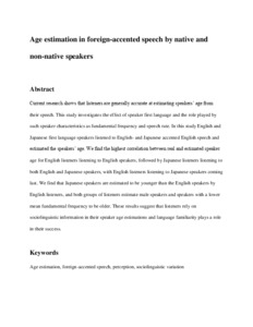 Current research shows that listeners are generally accurate at estimating speakers’ age from their speech. This study investigates the effect of speaker first language and the role played by such speaker characteristics as fundamental frequency and speech rate. In this study English and Japanese first language speakers listened to English- and Japanese-accented English speech and estimated the speaker’s age. We find the highest correlation between real and estimated speaker age for English listeners listening to English speakers, followed by Japanese listeners listening to both English and Japanese speakers, with English listeners listening to Japanese speakers coming last. We find that Japanese speakers are estimated to be younger than the English speakers by English listeners, and that both groups of listeners estimate male speakers and speakers with a lower mean fundamental frequency to be older. These results suggest that listeners rely on sociolinguistic information in their speaker age estimations and language familiarity plays a role in their success.