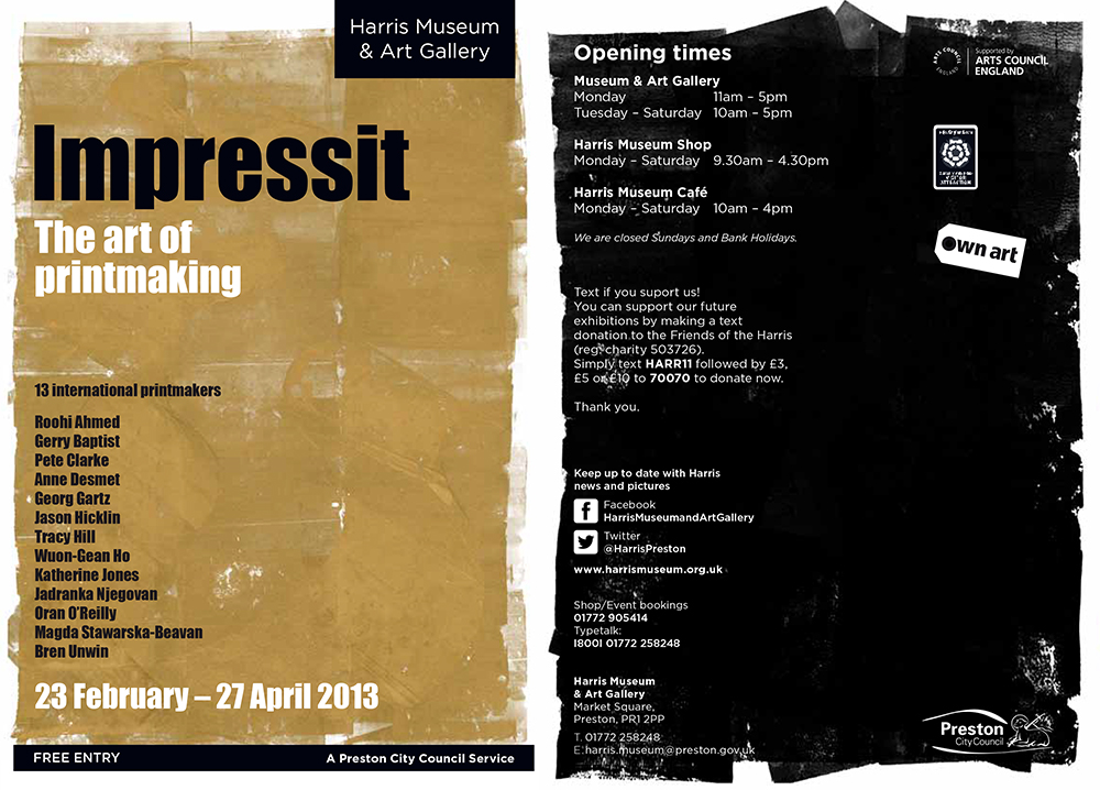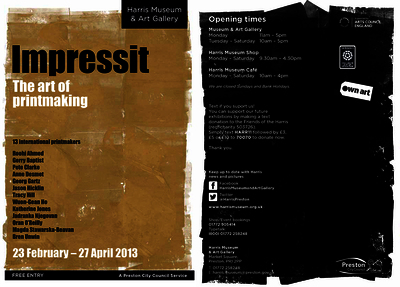 The ‘Impressit’ exhibition held in the 3 main galleries will include ‘the educational printmaking interactive space’, ‘the printmaking invitational’ of selected contemporary artists and new work by UCLan staff Pete Clarke, Tracy Hill and Magda Stawarska-Beavan.
