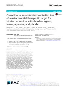 Berk, Michael, Turner, Alyna, Malhi, Gin S, Ng, Chee H, Cotton, Susan M, Dodd, Seetal, Samuni, Yuval, Tanious, Michelle, McAulay, Claire et al (2019) Correction to: A randomised controlled trial of a mitochondrial therapeutic target for bipolar depression: mitochondrial agents, N-acetylcysteine, and placebo. BMC Medicine, 17 (1). p. 35.