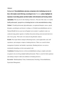 Background: Neurorehabilitation units play an important role in facilitating recovery for those with complex needs following a neurological event. National guidance highlights the importance of providing patients and their families with information and fostering realistic expectations. This may involve the breaking of bad news. The aim of this study is to explore health professionals’ perspectives on breaking bad news in the neurorehabilitation setting.