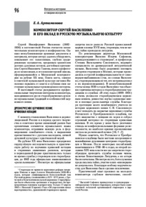 Аннотация. Сергей Никифорович Василенко (1882–1956) —талантливый музыкант, глубоко эрудированный хранитель русских духовных истоков, достойный преемник композиторской школы С. И. Танеева. Поиск своего места и «ниши» в советской музыкальной культуре, заставил Василенко скрывать от власти и публики свои настоящие музыкальные произведения и интересы.