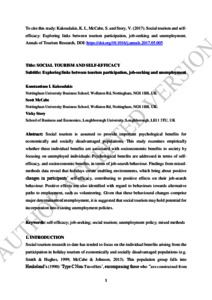 Kakoudakis, Konstantinos, McCabe, Scott and Story, Vicky (2017) Social tourism and self-efficacy: Exploring links between tourism participation, job-seeking and unemployment. Annals of Tourism Research, 65 . pp. 108-121. ISSN 0160-7383