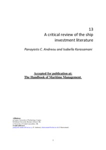Karasamani, Isabella and Andreou, Panayiotis (2019) A critical review of the ship investment literature. In: The Routledge Handbook of Maritime Management. Routledge International Handbooks, 1st ed . Routledge, pp. 203-220. ISBN 9781138671249
