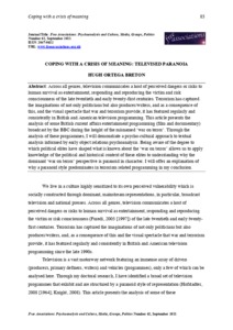 Across all genres, television communicates a host of perceived dangers or risks to human survival as entertainment, responding and reproducing the victim and risk consciousness of the late twentieth and early twenty-first centuries. Terrorism has captured the imaginations of not only politicians but also producer/writers, and as a consequence of this, and the visual spectacle that war and terrorism provide, it has featured regularly and consistently in British and American television programming. This article presents the analysis of some British current affairs entertainment programming (film and documentary) broadcast by the BBC during the height of the misnamed ‘war on terror’. Through the analysis of these programmes, I will demonstrate a psycho-cultural approach to textual analysis informed by early object relations psychoanalysis. Being aware of the degree to which political elites have shaped what is known about the ‘war on terror’ allows us to apply knowledge of the political and historical context of these elites to understanding why the dominant ‘war on terror’ perspective is paranoid in character. I will offer an explanation of why a paranoid style predominates in terrorism related programming in my conclusion.