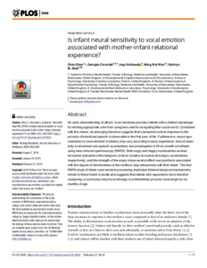 Zhao, Chen, Chronaki, Georgia orcid iconORCID: 0000-0001-5146-2510, Schiessl, Ingo, Wan, Ming Wai and Abel, Kathryn M. (2019) Is infant neural sensitivity to vocal emotion associated with mother-infant relational experience? PLoS ONE, 14 (2). e0212205.