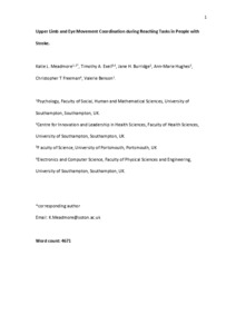 Meadmore, KL, Exell, TA, Burridge, JH, Hughes, AM, Freeman, CT and Benson, Valerie orcid iconORCID: 0000-0002-0351-4563 (2018) Upper limb and eye movement coordination during reaching tasks in people with stroke. Disability and rehabilitation, 40 (20). pp. 2424-2432. ISSN 0963-8288