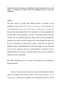 What really matters in creating mass mobilization, classical organization or new social media? A comparative case study of the mass mobilization process in France and South Korea.