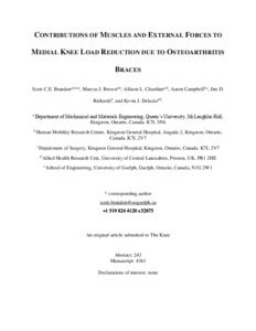 Bandon, Scott CE, Brown, Marcus J, Clouthier, Allison L, Campbell, Aaron, Richards, James orcid iconORCID: 0000-0002-4004-3115 and Deluzio, Kevin J (2019) Contributions of Muscles and External Forces to Medial Knee Load Reduction Due to Osteoarthritis Braces. The Knee, 26 (3). pp. 564-577. ISSN 0968-0160