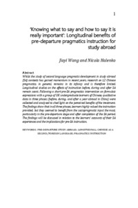 Whilst the study of second language pragmatic development in study abroad (SA) contexts has gained momentum in recent years, research on L2 Chinese pragmatics, in general, remains in its infancy and is therefore limited. Longitudinal studies on the effects of instruction before, during and after SA remain scant. Following a short pre-SA pragmatics intervention on formulaic expressions with a group of UK undergraduate learners of Chinese, qualitative data in three phases (before, during, and after a year abroad in China) were collected and analysed to shed light on the perceived benefits of the treatment. The findings show that in all three phases, learners highly valued the instruction provided, but they seemed to benefit from the sociopragmatic input the most, particularly in the pre-departure stage and after completion of the SA period. The findings will be discussed in relation to the learners' accounts of their SA experiences and the implications for pre-SA instruction