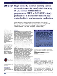High-intensity interval training versus moderate-intensity steady-state training in UK cardiac rehabilitation programmes (HIIT or MISS UK): study protocol for a multicentre randomised controlled trial and economic evaluation.