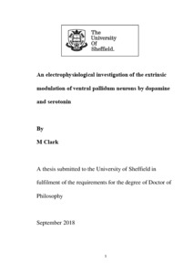 Clark, Martin orcid iconORCID: 0000-0002-3315-5629 (2018) An electrophysiological investigation of the extrinsic modulation of ventral pallidum neurons by dopamine and serotonin. Doctoral thesis, The University of Sheffield.