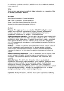 Purpose - This paper reports on an evaluation of the UK Healthy Universities Network, which: explored engagement of Network members; identified what members value about the Network; examined facilitators and barriers to engagement; and informed the Network’s future development.