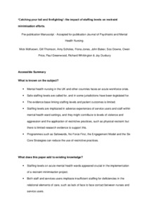 Results: Five themes were identified regarding how staffing levels impact experiences and complicate efforts to minimise physical restraint. We titled the themes – ‘insufficient staff to do the job’; ‘detriment to staff and service users’; ‘a paperwork exercise: the burden of non-clinical tasks’; ‘false economies’; and, ‘you can’t do these interventions’.