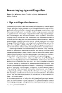 We look at Sign Multilingualism from several perspectives. Section 1.1 compares various branches of bi- and multilingualism research involving sign languages, and equivalent or related phenomena from research on spoken languages, in order to place the study in a wider context of bilingualism research. This section also identifies some interesting phenomena from the