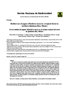 The study was carried out in a median stature tropical forest in the north of Quintana Roo during 2008, 2010-2012, using camera traps to record activity and habitat use by jaguar and other vertebrates. Spatial and temporal variations in habitat use, activity patterns, and species associations were analyzed using a chi-squared test (x2). Generalized