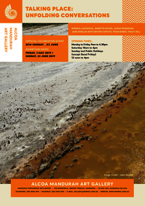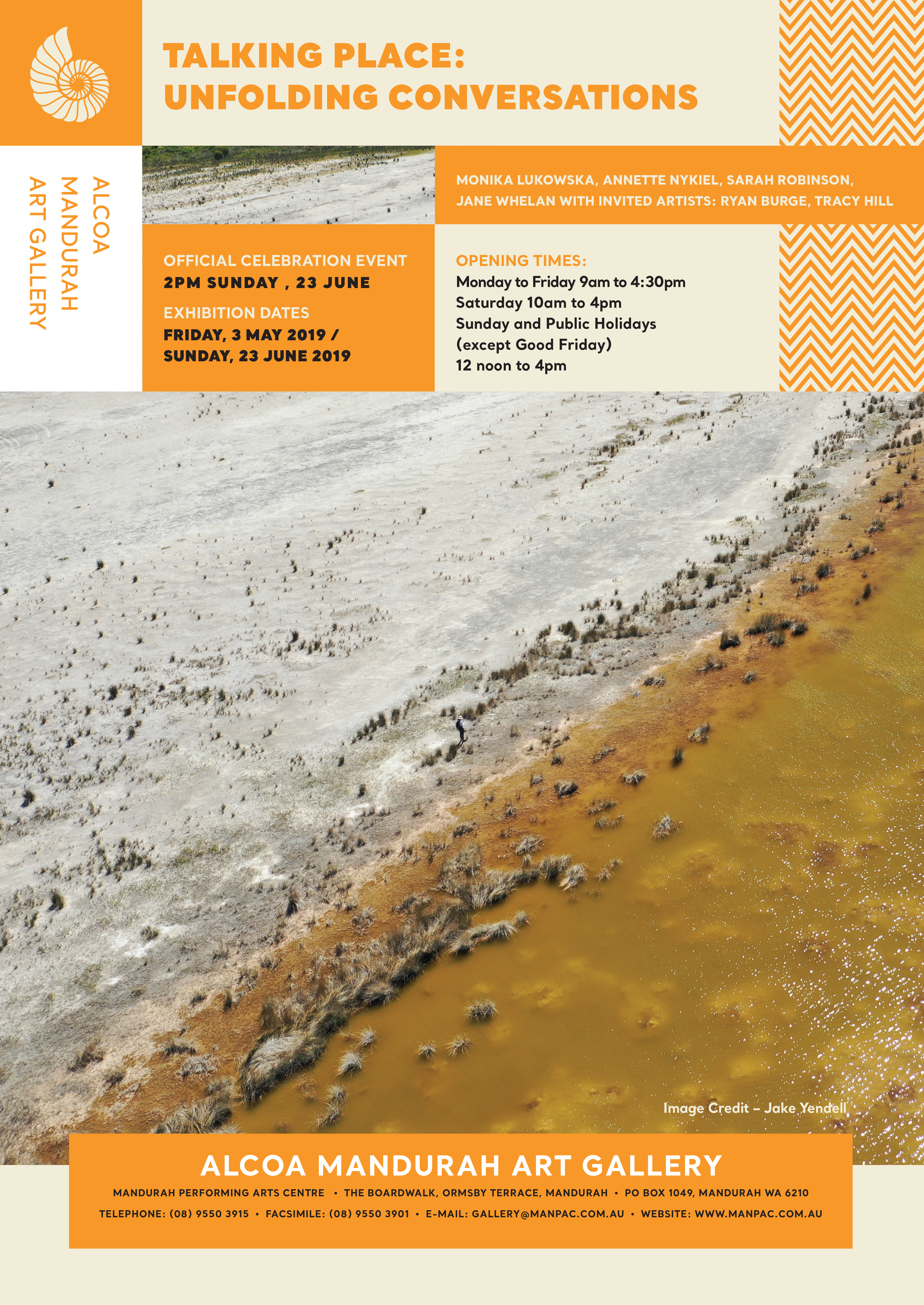 alking Place: Unfolding Conversations is a collaborative exhibition between Tracy Hill, Monika Lukowska, Annette Nykiel, Sarah Robinson, and Jane Whelan that explores the significance of wetlands with particular focus on Lake Walyungup; a shallow, ephemeral salt-lake in the Rockingham area known by the local Noongar people as ‘the place where people talk’. Lake Walyungup is a seemingly forgotten, empty space in the midst of a growing urban community which offers shelter to migratory birds and wildlife. It has a deep history embedded in thrombolite remains, links with the Noongar community and various historical uses by the passing groups of settlers and armed forces.