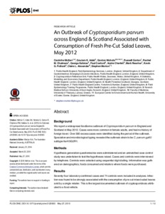 Kirk, Martyn, McKerr, Caoimhe, Adak, Goutam K., Nichols, Gordon, Gorton, Russell, Chalmers, Rachel M., Kafatos, George, Cosford, Paul, Charlett, Andre et al (2015) An Outbreak of Cryptosporidium parvum across England & Scotland Associated with Consumption of Fresh Pre-Cut Salad Leaves, May 2012. PLOS ONE, 10 (5). e0125955.