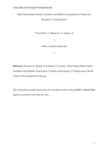 Nowland, Rebecca orcid iconORCID: 0000-0003-4326-2425, Balmer, D and Qualter, Pamela (2019) When Friends Behave Badly: Loneliness and Children's Expectations of Friends and Responses to Transgressions. British Journal of Developmental Psychology, 37 (4). pp. 551-570. ISSN 0261-510X