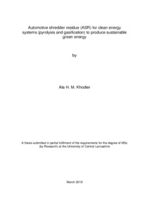 Khodier, Ala (2019) Automotive shredder residue (ASR) for clean energy systems (pyrolysis and gasification) to produce sustainable green energy. Masters thesis, University of Central Lancashire.