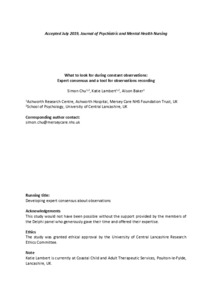 Introduction. Supportive observations are common in mental health care but there are no guidelines on best practice or what should be documented in observations records. Aim. To develop expert consensus on the important aspects of patient presentation that inform clinical decision-making about observations, and to develop a recording tool from this consensus. Method. A Delphi methodology was used to consult an expert panel of mental health clinicians and academics to agree on what aspects of patient presentation during constant observations are important in informing clinical decisions. Thematic analysis was applied to the agreed item set to extract common aspects of presentation and behaviour. Results. The panel considered 118 individual items across three rounds of consultation and agreed that 51 items were important to clinical decisions about observations. Thematic analysis found six man themes: agitation, self-harm and suicide, violence, negative influence, disengagement and positive behaviour. Sub-themes were used to create the MerseyCare Supportive Observations Recording Tool (MSORT). Discussion. These data represent the first expert consensus on the aspects of patient presentation that are important to clinical decisions. Implications for practice. Consensus items should be recorded in observations records and be considered in decision-making about observations. The MSORT may aid observations recording.