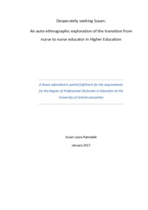 Ramsdale, Susan Laura (2017) Desperately seeking Susan: An auto-ethnographic exploration of the transition from nurse to nurse educator in Higher Education. Doctoral thesis, University of Central Lancashire.