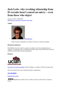 This article for The Conversation is a brief discussion of the response to the removal of British citizenship from IS recruits. it briefly discusses the cases of Jack Letts, whose British citizenship was removed in August 2019, and Shamima Begum, whose citizenship was removed in February 2019.