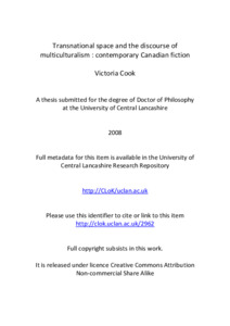 Cook, Victoria Maria (2010) Transnational Space and the Discourse of Multiculturalism: Contemporary Canadian Fiction. Doctoral thesis, University of Central Lancashire.