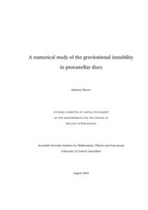 Mercer, Anthony Paul (2019) A numerical study of the gravitational instability in protostellar discs. Doctoral thesis, University of Central Lancashire.