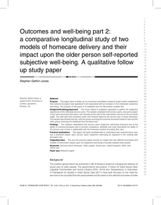 Gethin-Jones, Stephen (2012) Outcomes and Well-being Part 2: A comparative longitudinal study of two models of homecare delivery and their impact upon the older person self-reported subjective well-being. A qualitative follow up study paper. Working with Older People, 16 (2). pp. 52-61. ISSN 1366-3666