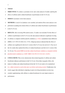 To conduct a systematic review and a meta-analysis of studies exploring the effects of caffeine and/or sodium bicarbonate on performance in the Yo-Yo test. Systematic review and meta-analysis. A total of six databases were searched, and random-effects meta-analyses were performed examining the isolated effects of caffeine and sodium bicarbonate on performance in the Yo-Yo test. After reviewing 988 search records, 15 studies were included. For the effects of caffeine on performance in the Yo-Yo test, the meta-analysis indicated a significant favoring of caffeine as compared with the placebo conditions (p=0.022; standardized mean difference [SMD]=0.17; 95% CI: 0.08, 0.32; +7.5%). Subgroup analyses indicated that the effects of caffeine were significant for the level 2 version of the Yo-Yo test, but not level 1. Four out of the five studies that explored the effects of sodium bicarbonate used the level 2 version of the Yo-Yo test. The pooled SMD favored the sodium bicarbonate condition as compared with the placebo/control conditions (p=0.007; SMD: 0.36; 95% CI: 0.10, 0.63; +16.0%). This review demonstrates that isolated ingestion of caffeine and sodium bicarbonate enhances performance in the Yo-Yo test. Given these ergogenic effects, the intake of caffeine and sodium bicarbonate before the Yo-Yo test needs to be standardized (i.e., either restricted or used in the same way before each testing session). Furthermore, the results suggest that individuals competing in sports involving intermittent exercise may consider supplementing with caffeine or sodium bicarbonate for acute improvements in performance. [Abstract copyright: Copyright © 2019 Sports Medicine Australia. Published by Elsevier Ltd. All rights reserved.]