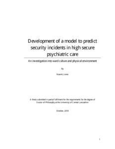 Jones, Naomi Sadie (2018) Development of a model to predict security incidents in high secure psychiatric care. An investigation into ward culture and physical environment. Doctoral thesis, University of Central Lancashire.