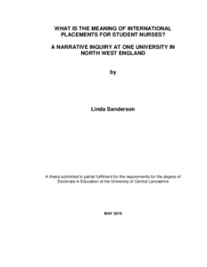 Sanderson, Linda (2019) What is the meaning of international placements for student nurses? A narrative inquiry at one university in north west England. Doctoral thesis, University of Central Lancashire.