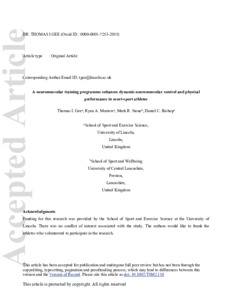 Gee, Thomas I., Morrow, Ryan A., Stone, Mark R. orcid iconORCID: 0000-0003-0735-287X and Bishop, Daniel C. (2019) A neuromuscular training programme enhances dynamic neuromuscular control and physical performance in court‐sport athletes. Translational Sports Medicine . ISSN 2573-8488