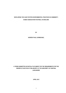 This thesis proposes the development of pro-environmental practices within football in order to reduce the sport's environmental impact. While research into the relationship between sport and the environment is growing, it remains largely focused upon the professional, commercial, and spectacular elite sector of sport. Much of the sport and environment literature, and advice provided by sport governing bodies, is written from the perspective that individual-centric models of behaviour are absolute and self-help can achieve desirable outcomes. Instead football should be considered as a social practice and the way to achieve change is to examine the relationships between the elements that contribute towards the creation of that practice.