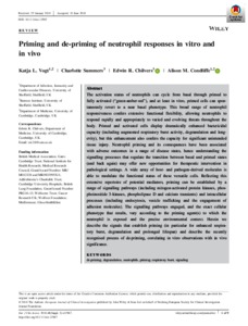 The activation status of neutrophils can cycle from basal through primed to fully activated (“green‐amber‐red”), and at least in vitro, primed cells can spontaneously revert to a near basal phenotype. This broad range of neutrophil responsiveness confers extensive functional flexibility, allowing neutrophils to respond rapidly and appropriately to varied and evolving threats throughout the body. Primed and activated cells display dramatically enhanced bactericidal capacity (including augmented respiratory burst activity, degranulation and longevity), but this enhancement also confers the capacity for significant unintended tissue injury. Neutrophil priming and its consequences have been associated with adverse outcomes in a range of disease states, hence understanding the signalling processes that regulate the transition between basal and primed states (and back again) may offer new opportunities for therapeutic intervention in pathological settings. A wide array of host‐ and pathogen‐derived molecules is able to modulate the functional status of these versatile cells. Reflecting this extensive repertoire of potential mediators, priming can be established by a range of signalling pathways (including mitogen‐activated protein kinases, phosphoinositide 3‐kinases, phospholipase D and calcium transients) and intracellular processes (including endocytosis, vesicle trafficking and the engagement of adhesion molecules). The signalling pathways engaged, and the exact cellular phenotype that results, vary according to the priming agent(s) to which the neutrophil is exposed and the precise environmental context. Herein we describe the signals that establish priming (in particular for enhanced respiratory burst, degranulation and prolonged lifespan) and describe the recently recognised process of de‐priming, correlating in vitro observations with in vivo significance.
