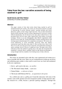 This paper consists of four short stories about being coached in golf by elite/professional golf coaches. The stories are first-person narrative accounts of experiencing, in action, different coaches‟ personal attitudes and beliefs about how golfers in their charge might learn best. The accounts demonstrate that the beliefs held and corrective actions implemented by successive coaches differed dramatically, but all directed at the same player (David Grecic) who presented them with the same stroke characteristics and frailties in personal technique. Written in an auto-ethnographic style, David‟s experiences richly disclose for the reader the varying philosophies towards coaching practice and eliciting improved performance in a competition environment. The stories also reveal dimensions of social positioning, perceived status and identity construction in golf that others may relate to. Above all they show what it feels like to be on the receiving end of such varied but well-intentioned reasoning in sports coaching, however effective it might have been. The paper closes with a reflection on how this method of getting close to the data, has invigorated the researcher‟s curiosity about a problem which he had become accustomed to seeing through relatively standard, if not limiting lenses of data collection.