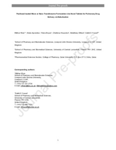 Khan, Iftikhar, Apostolou, Maria, Bnyan, Ruba, Houacine, Chahinez, Elhissi, Abdelbary and Yousaf, Sakib orcid iconORCID: 0000-0001-7010-4663 (2020) Paclitaxel-loaded Micro or Nano Transfersome Formulation into Novel Tablets for Pulmonary Drug Delivery via Nebulization. International Journal of Pharmaceutics, 575 . p. 118919. ISSN 0378-5173