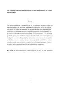 The Anti-social Behaviour, Crime and Policing Act 2014 introduced new powers to deal with behaviour deemed to be 'anti-social'. In this paper we consider how the new law could be used against sex workers and their clients and the impact this may have. Although the new powers were not intentionally designed to respond to prostitution, we suggest that they will be utilised to tackle it. We argue that the law will be used inconsistently in a way which will go directly against policy which seeks to 'tackle demand' and take a less punitive approach to dealing with sex workers. Despite a policy shift to see sex workers more as victims and less as offenders, we draw on existing evidence to demonstrate that the new anti-social behaviour order law will be utilised to exclude street sex workers from public spaces. We claim that a degree of 'policy re-fraction' will occur when the new laws are implemented by practitioners.