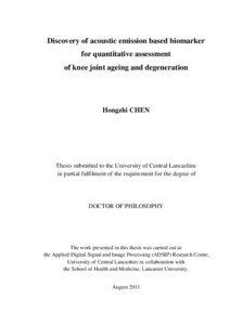 Chen, Hongzhi (2011) Discovery of acoustic emission based biomarker for quantitative assessment of knee joint ageing and degeneration. Doctoral thesis, University of Central Lancashire.