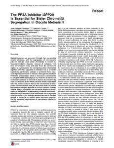 Chambon, Jean-Philippe, Touati, Sandra A., Berneau, Stephane orcid iconORCID: 0000-0003-4181-2745, Cladière, Damien, Hebras, Céline, Groeme, Rachel, McDougall, Alex and Wassmann, Katja (2013) The PP2A inhibitor I2PP2A is essential for sister chromatid segregation in oocyte meiosis II. Current Biology, 23 (6). pp. 485-490. ISSN 0960-9822