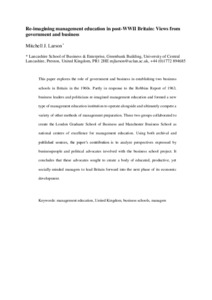 This paper explores the role of government and business in establishing two business schools in Britain in the 1960s. Partly in response to the Robbins Report of 1963, business leaders and politicians re-imagined management education and formed a new type of management education institution to operate alongside and ultimately compete a variety of other methods of management preparation. These two groups collaborated to create the London Graduate School of Business and Manchester Business School as national centers of excellence for management education. Using both archival and published sources, the paper’s contribution is to analyze perspectives expressed by businesspeople and political advocates involved with the business school project. It concludes that these advocates sought to create a body of educated, productive, yet socially-minded managers to lead Britain forward into the next phase of its economic development.