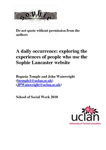 Temple, Bogusia and Wainwright, John Peter orcid iconORCID: 0000-0002-8190-0144 (2010) A daily occurence: Exploring the experiences of people who use the Sophie Lancaster website. Discussion Paper. Sophie Lancaster Foundation, Preston, Lancashire.