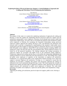 The purposeof this study is to explore the underlying mechanism of approach job crafting and thriving at work that explain the relationship between perceived supervisor support and job satisfaction amongpublic sector employees. Drawing on job demand and resource model and organization support theory, the study aims to investigate the proposed serial mediation in public sector employees in Pakistan. By examining the sequential relationships among perceived supervisor support, approach job crafting, thriving at work, and ultimately job satisfaction, this research seeks to provide a comprehensive understanding of the dynamics within public sector organizations and offer insights for enhancing employee satisfaction. Based on cross sectional data from 369 public sector employees,Smart PLS 4andstructural equation modeling (SEM) wereemployedto analyze the data and study the serial mediation effect. Strong empirical evidence was found for all the proposed hypotheses. The findings indicated that stronger perceptions of supervisor support are associated with higher levels of job satisfaction among employees. Furthermore, approach job crafting and thriving at work mediate this relationship, highlighting theemployee behavior to actively shape theirroles and experiences at work. The findings show a path for public sector employees to capitalize on the antecedents to employee job satisfaction. Furthermore, it is suggested that public sector organizations should encourage active supervisor support to promote employee job satisfaction. In doing so, it is important to ensure that the employees are provided a workplace that pursues and encourages approach job crafting for enhanced levels of job satisfaction through thriving at work. This study expands theresearch on approach job crafting and sheds light on important conditions under which perceived supervisor support promotes job satisfaction in public sector employees in Pakistan. The study holds importance for public sector employees, supervisors and the public sector departments at large.